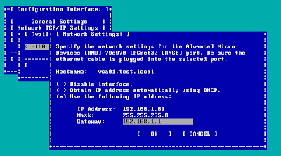 Перемещаясь между элементами интерфейса при помощи Tab, задайте сетевые настройки виртуальной машины. В поле Hostname введите полное DNS имя узла, снимите флаг с Disable Interface и включите Use the following IP address. Введите необходимые IP адрес, маску подсети и маршрутизатор по-умолчанию. Нажмите несколько раз OK, чтобы принять настройки. Вернитесь в главное меню (Back) и выйдите из настроек (Logout).